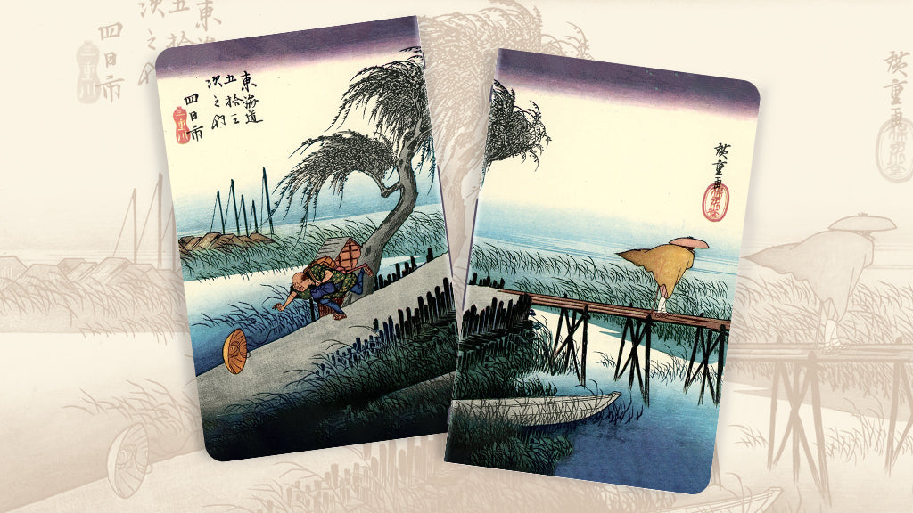 Based on Hiroshige's woodblock #44 from his famous series "Fifty-three Stations of the Tokaido Road" issued in the 1830's. Hiroshige captures a windy day with the coat of the figure on the right blowing sideways, and the straw hat of the man on left blowing away from him.