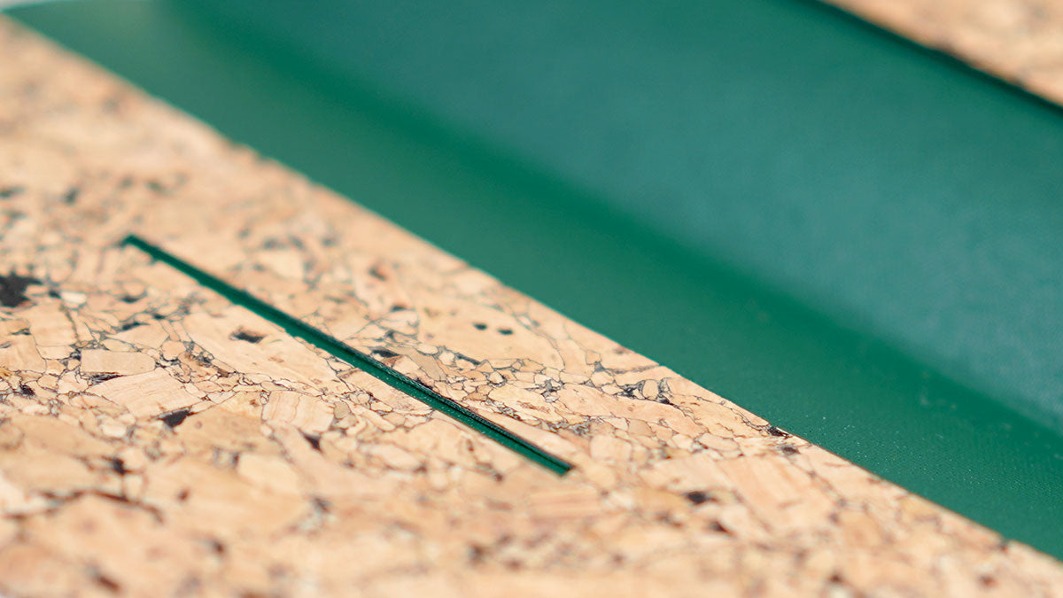 The Blackbird billfold contains thin cork on the outside, and forest green inside.