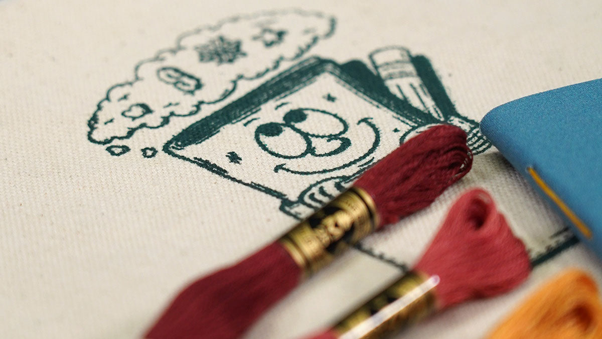 The notebook cover is made using a very thin fabric to make for easy stitching. Inside the notebook you'll find a fantastic endsheet that was screenprinted to have a semi-transparent effect. The pages are graph, perfect for planning your next embroidery pattern.
