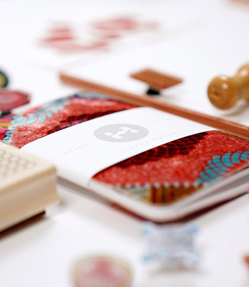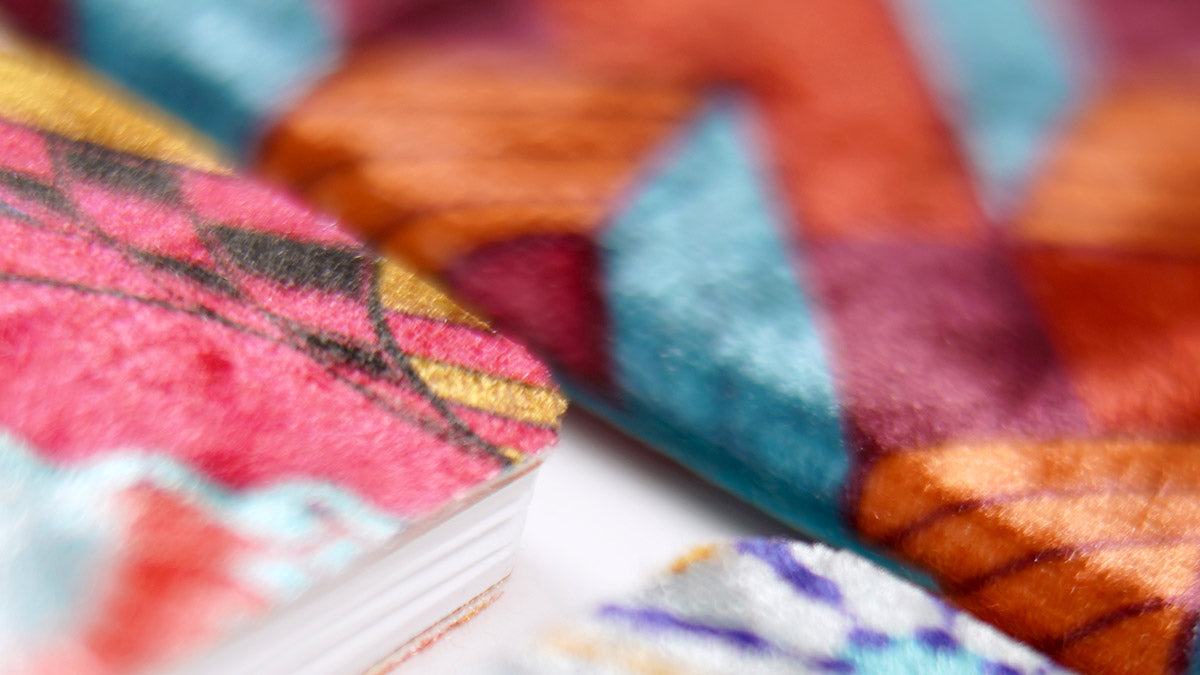 Kim lives on the sunny island of St. Lucia, and brought the uplifting vibes of the island into this set of six colorfully-illustrated patterns. We printed the six designs in a repeating pattern onto marbled velvet, which shifts tones as the light moves adding another dimension to the notebooks. The covers are super soft, and honestly the photos I took don't do justice to how beautiful they look in person.