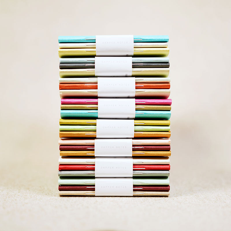 The regular Dapper Notes you know and love are made with a double-cloth cover, contain an extra decorative endsheet, and are hand-sewn with a wax thread finish. Kraft series notebooks have the same smooth paper inside, and unlike their cloth-covered siblings are saddle stitched (stapled) over cover stock.