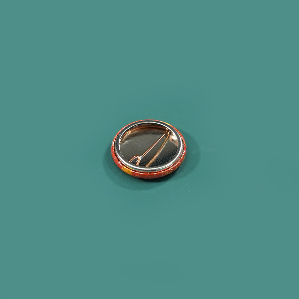 Pack includes: 1-inch wide pinback button, and 2½-inch wide label sticker. Presented in a glassine pack with hang tag,