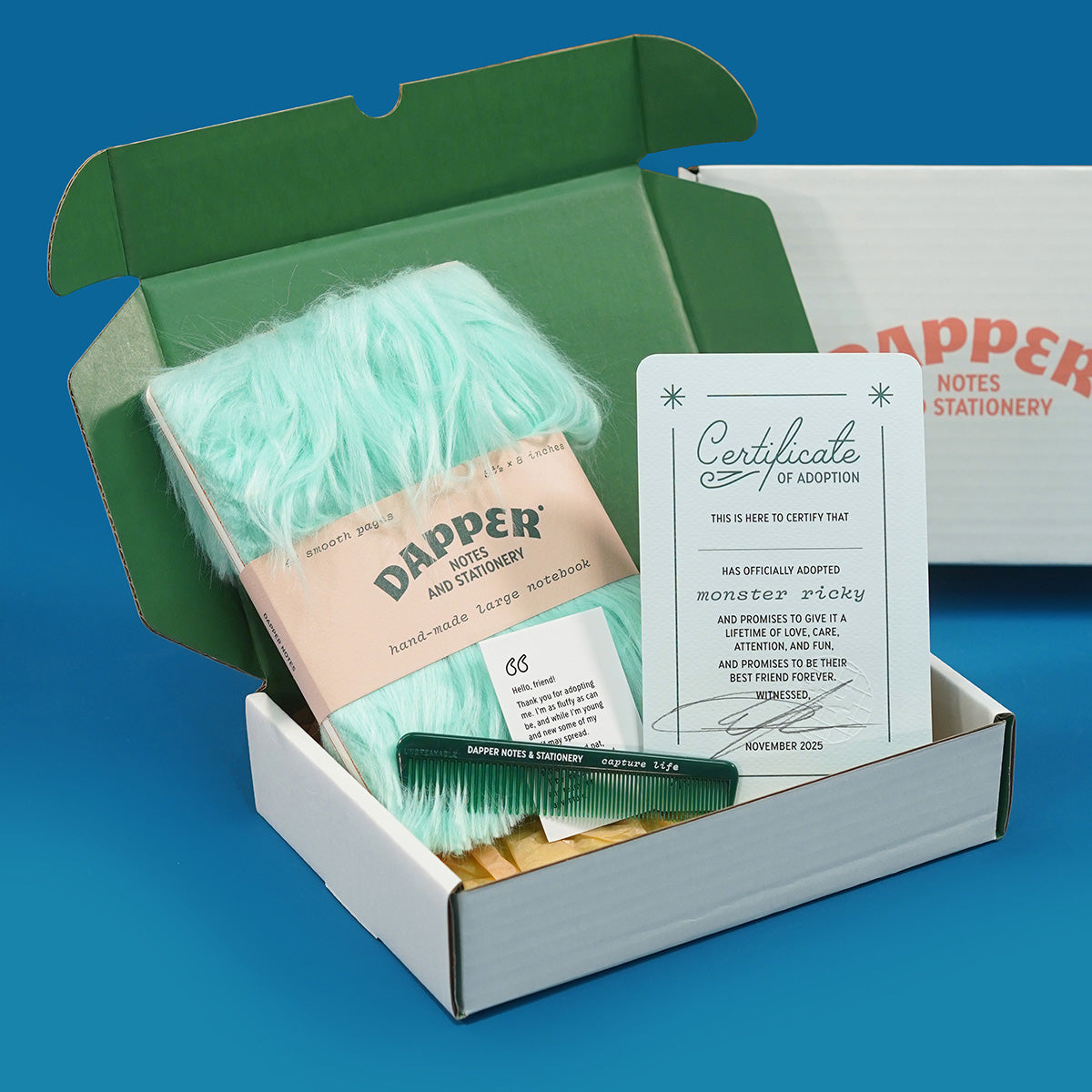 Your Monster Ricky will arrive in a white and green box, screen printed with peach colored ink to match the bely band. Also included: a Dapper Notes unbreakable comb, so you can doll up your Little Monster.