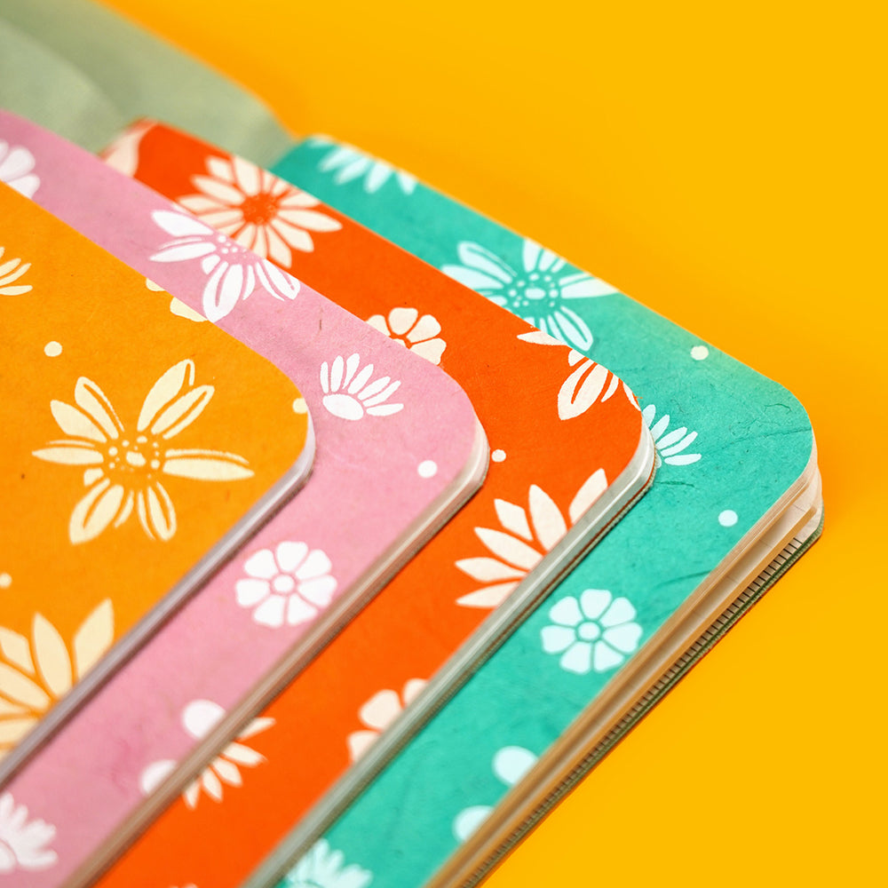 Inside you'll find screenprinted endsheets with a floral pattern that Selina designed back in May. Echos of those blooms were brought onto the updated cover design. Plus each paper style has a unique color combination including its thread, endsheet, and stat card.