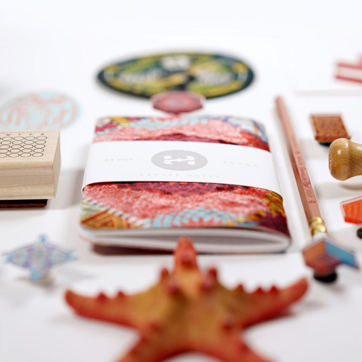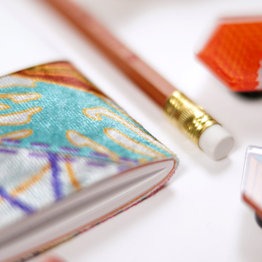 Kim lives on the sunny island of St. Lucia, and brought the uplifting vibes of the island into this set of six colorfully-illustrated patterns. We printed the six designs in a repeating pattern onto marbled velvet, which shifts tones as the light moves adding another dimension to the notebooks. The covers are super soft, and honestly the photos I took don't do justice to how beautiful they look in person.