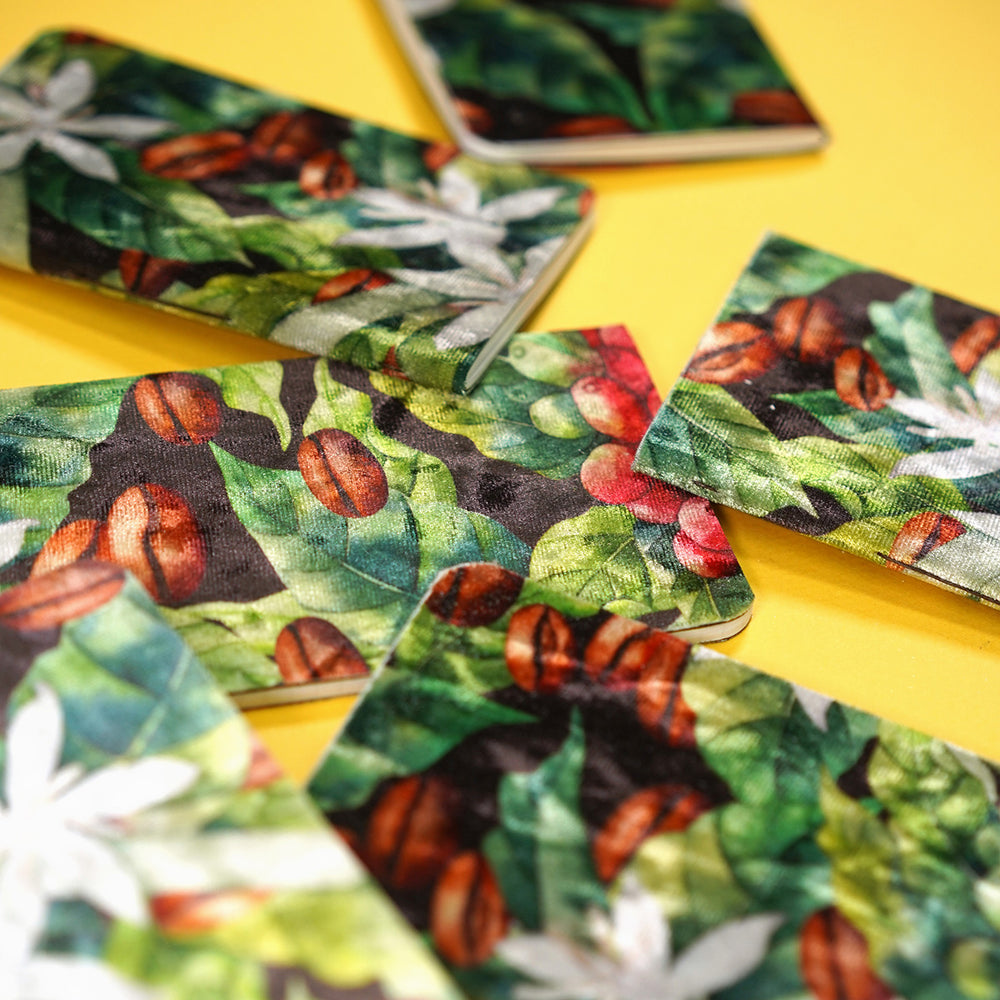 A velvety sheen that's oh so fun to touch brings extra vibrancy (yes, vibrancy) to the coffee berry and bean cover illustration. So tasty you'd almost want to brew it.