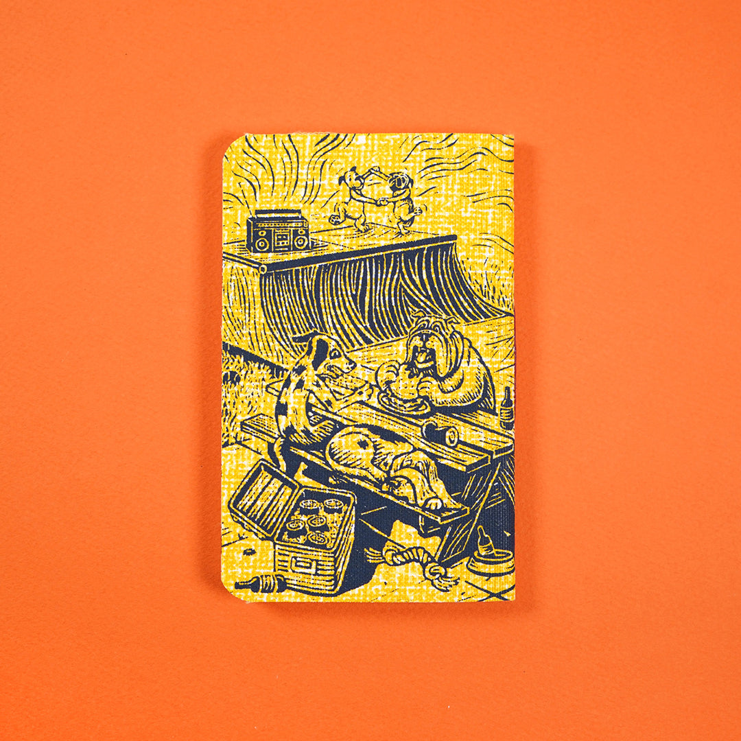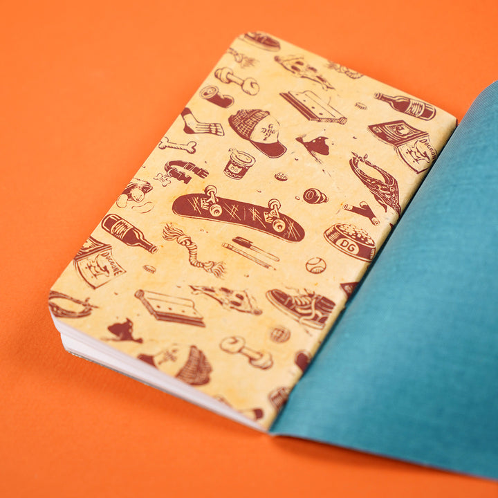 A matching sticker is included free with every notebook. The sticker features a skateboarding spaniel from the notebook's cover imprint, and is printed using Dylan's signature woodcut style.