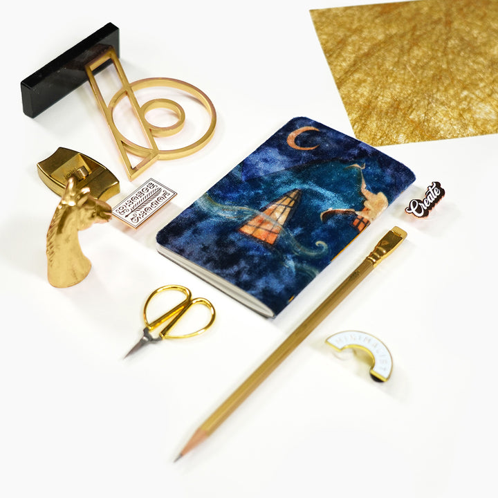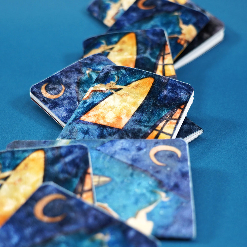 A collaboration with Normandie Syken, an illustrator from Queens NY whose work is filled with eccentric and geometric scenes. The cover for Flying To is from Normandie's series on The Traveling Companion (tales by Hans Christian Andersen), and was originally illustrated in watercolor gouache and pen. We printed the illustration onto one of the shiniest and softest materials we could find, so that the notebook glitters as it moves through the light.