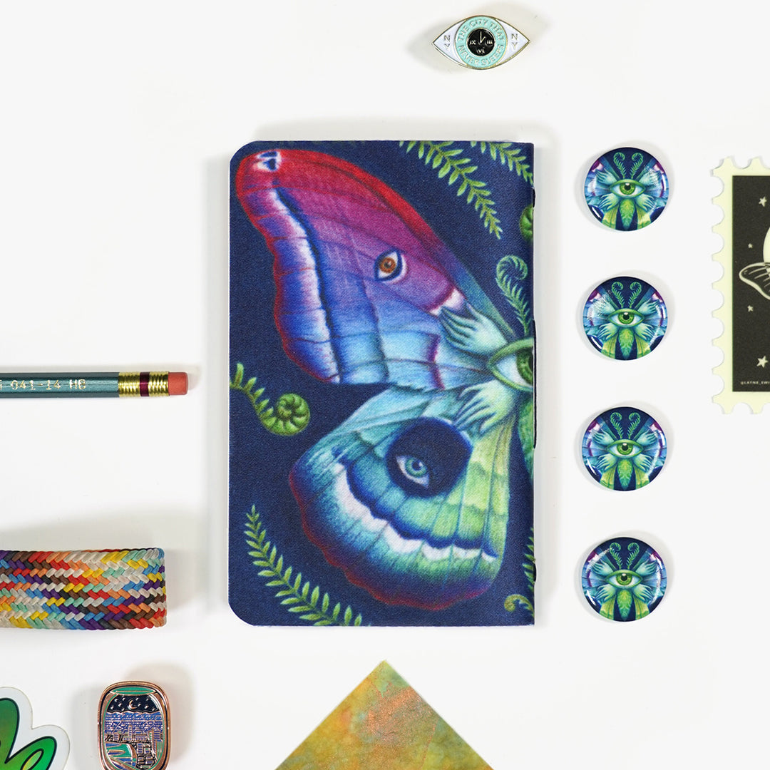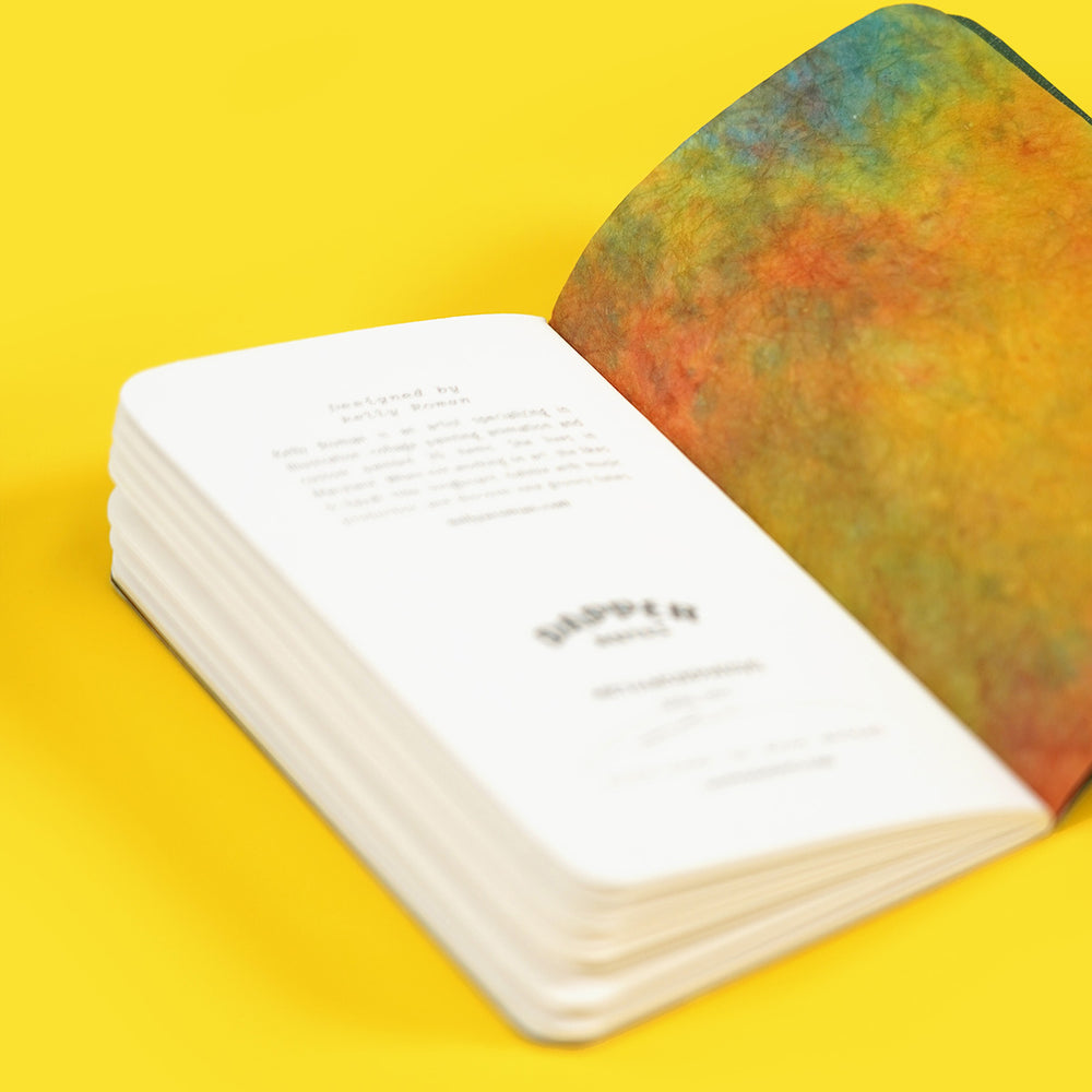 This edition was designed with artist Kelly Roman whose work explores organic and psychedelic themes. Metamorphosis's cover features a pencil illustration printed onto satin that looks and reflects light like a moth's wings. Inside you'll find tie dye endsheets and pages that are blank on the left and dot grid on the right.