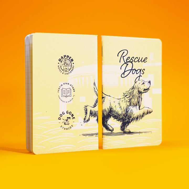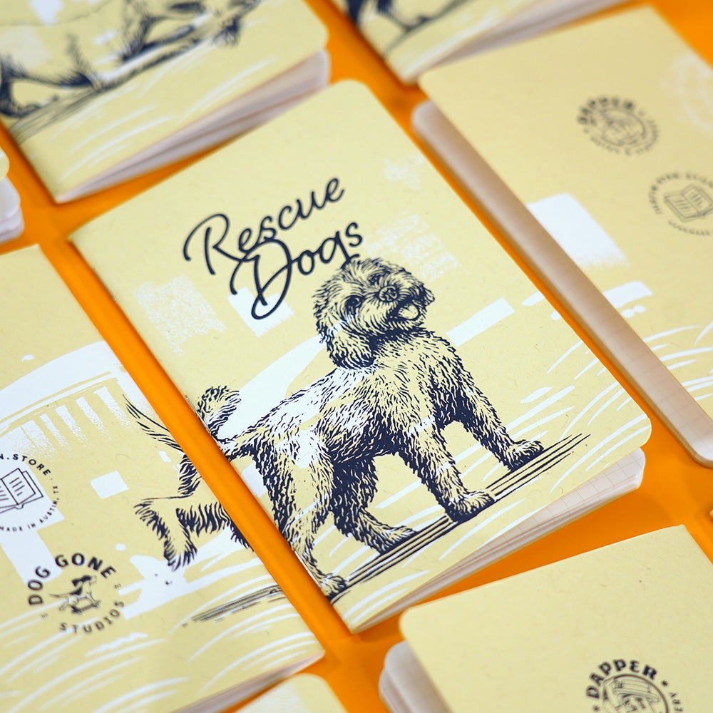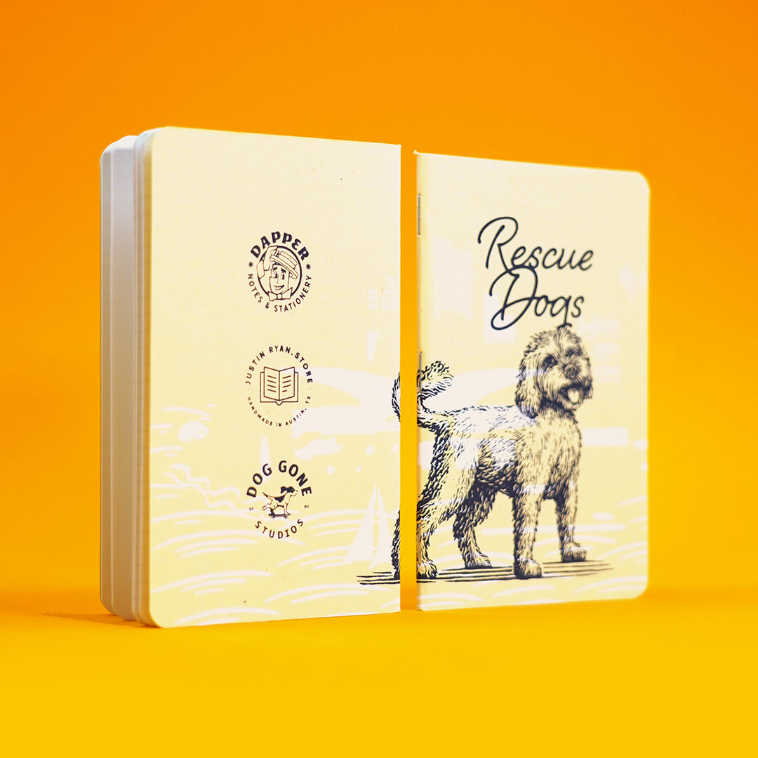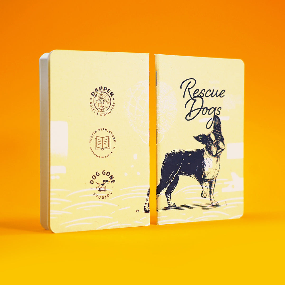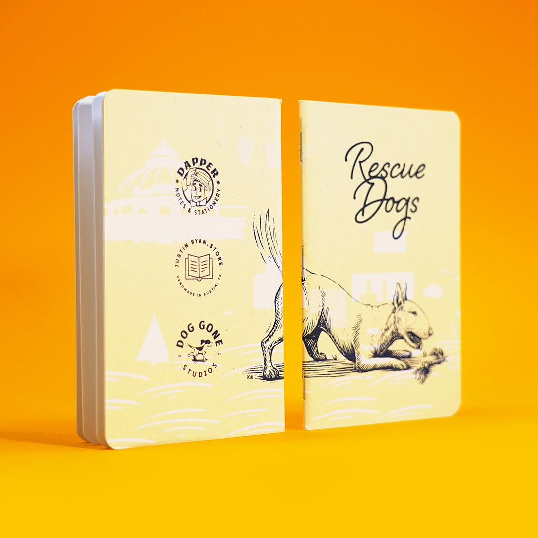 This year I teamed up with both Dylan Goldberger and husband-and-wife duo Justin Ryan Books to create the Kraft Series edition. Rescue Dogs came about as a result of a stack of posters that Dylan started to print, but while printing the second color he noticed they had improper registration and couldn't be used for their intended purpose. We decided to put that pile of paper to good use by printing a selection of Dylan's dog illustrations as notebook covers. So I designed the covers using Dylan's dog breed illustrations, Dylan screen printed the notebook design using his signature blue, and he sent them off to Justin Ryan Books who put them all together using 70lb Dapper Notes paper I provided.