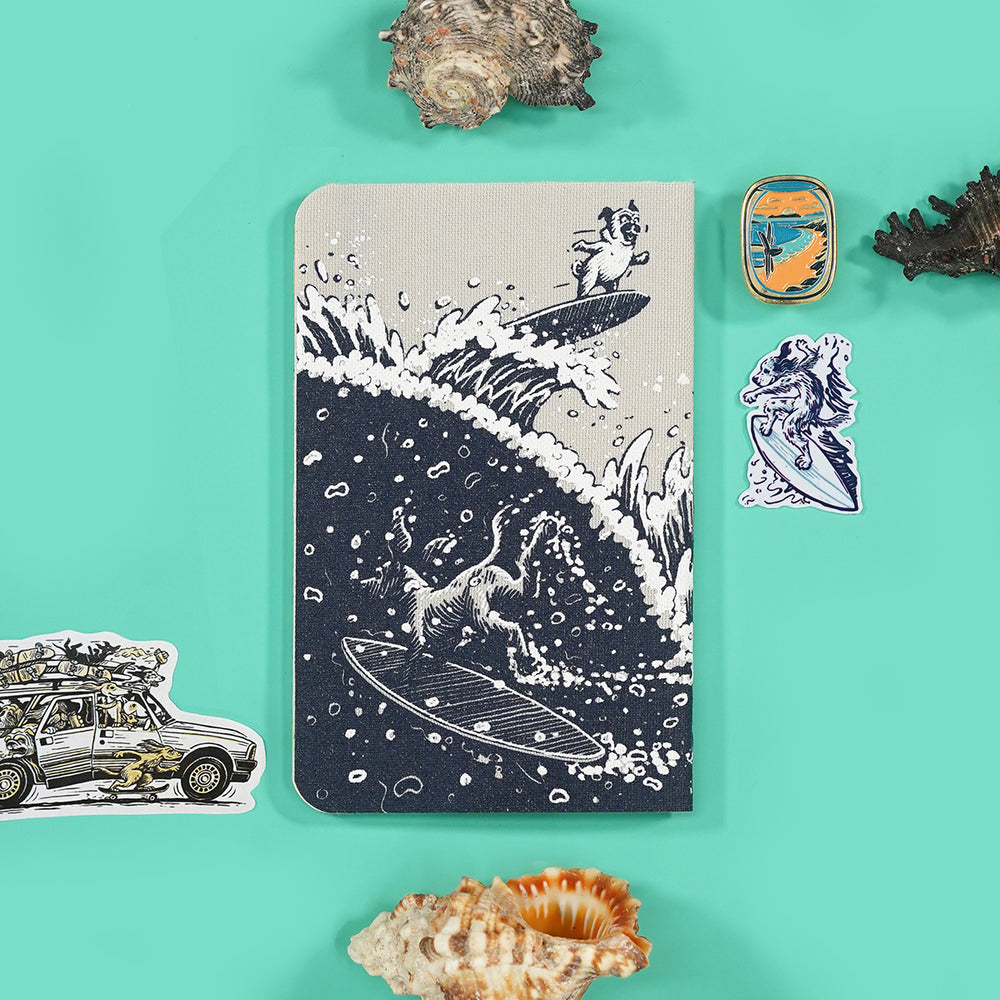 The cover for our fourth collab features the second part of the story, showcasing the hounds in the water, happily surveying the waves. It's such a joyous scene, and it puts a smile on my face every time I look at it. As if that’s enough, the decorative endsheets inside tell the third part of the story, showing one of the hounds resting after a long day of surfing.
