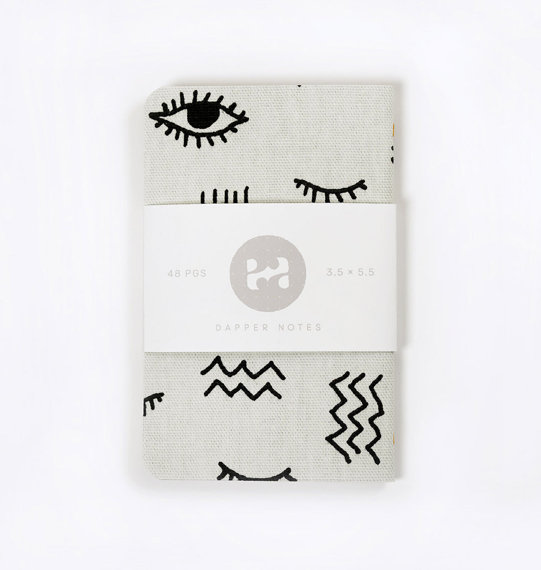 One Eye Open contains: A monoline illustration pattern on the outside, jet black inside, with a crinkly pearlescent endsheet, 32 dot grid pages on 70lb smooth white, and a sunshine thread finish.