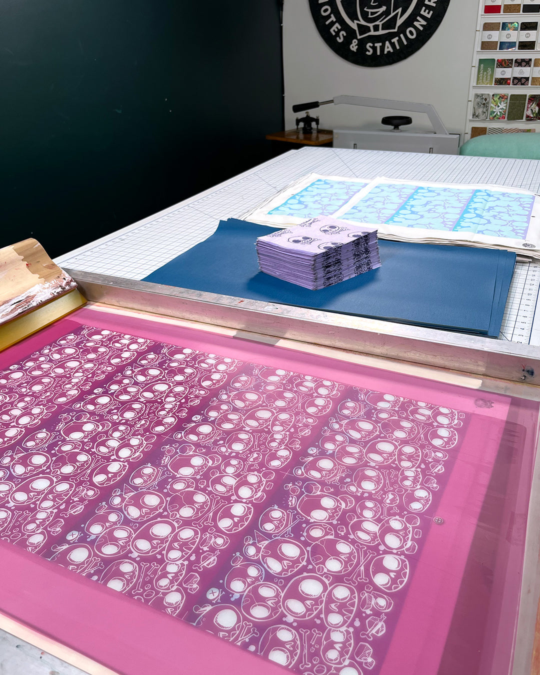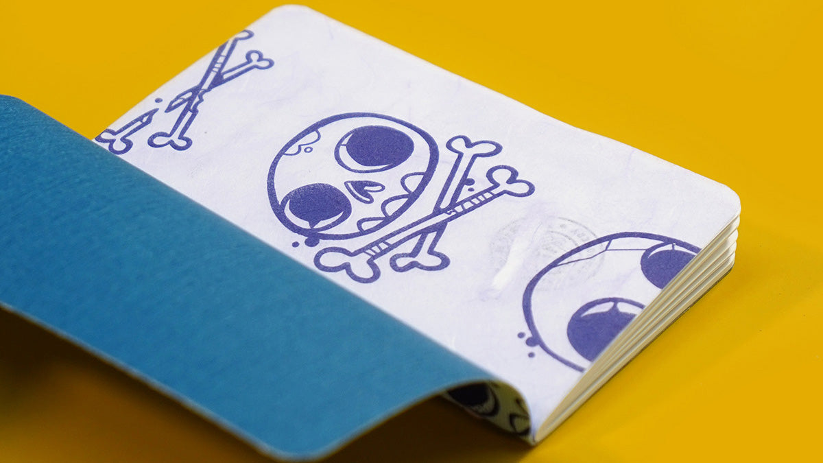 Skulls are a huge vibe at Jetpacks & Rollerskates, it's literally in Blake's logo. So for the October release Blake illustrated a cover that brings his very unique and energetic style into, well: skulls. The background colors was printed onto a woven fabric, and I screen printed a dark purple layer onto the cover. Blake designed the background in a freeform sort of way, so that I did not have to be a perfectionist with alignment during my screen printing. Though it is still me who screen printed the covers, so each cover's print saturation varies and shows the hand-made nature of this printing process. Pretty cool.