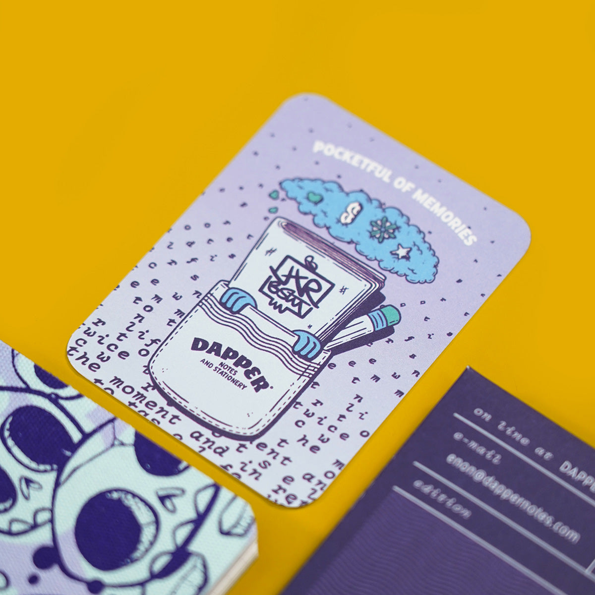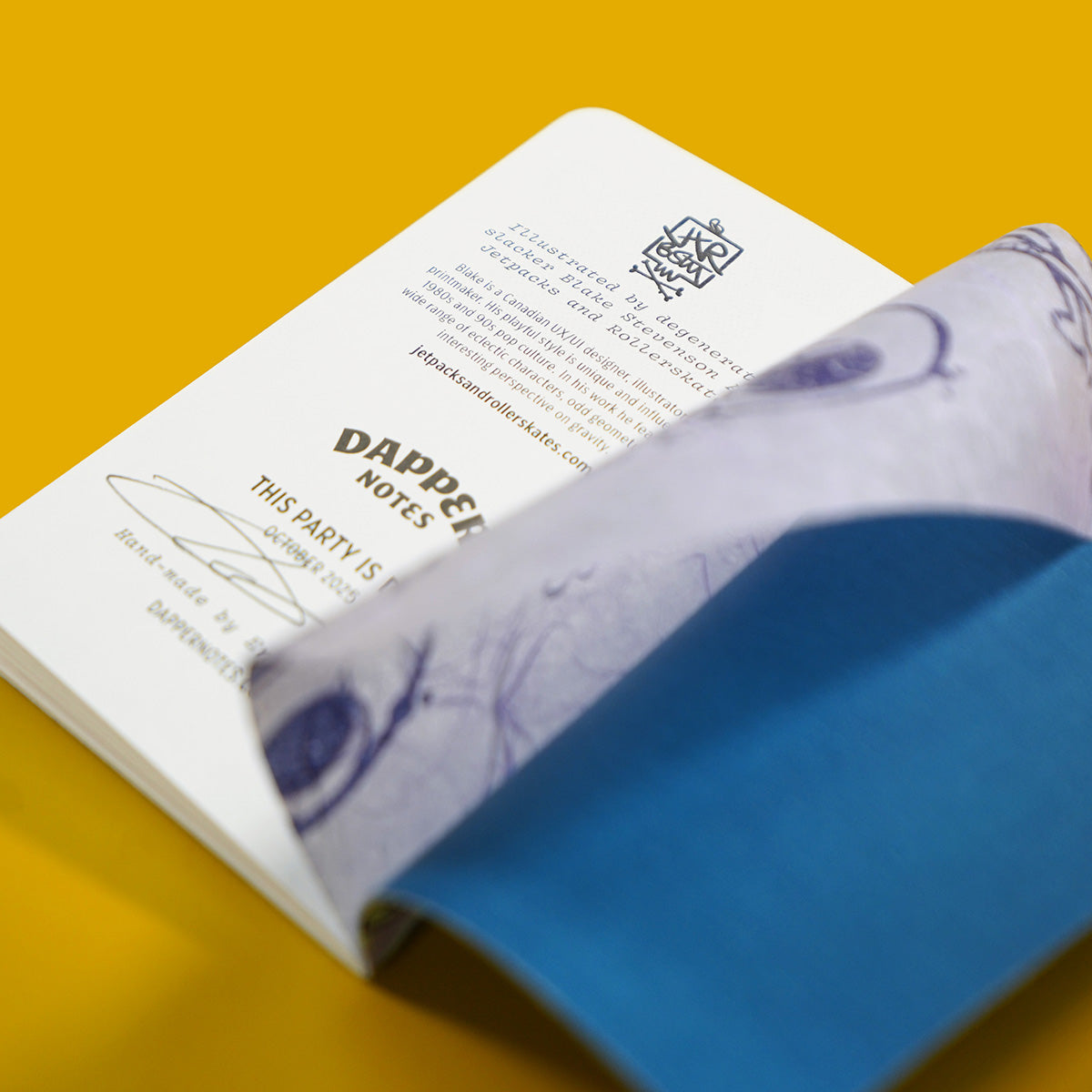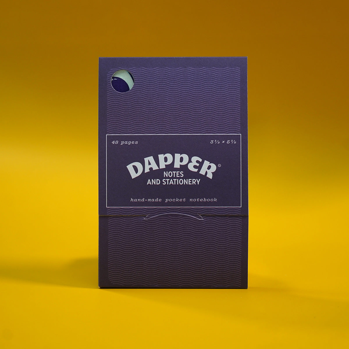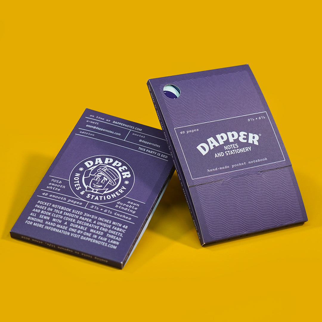This edition features the very first dark paper packaging, where instead of the standard Dapper Notes green on a light colored background, we have a light blue imprint on a dark purple the coordinates with the cover's ink.